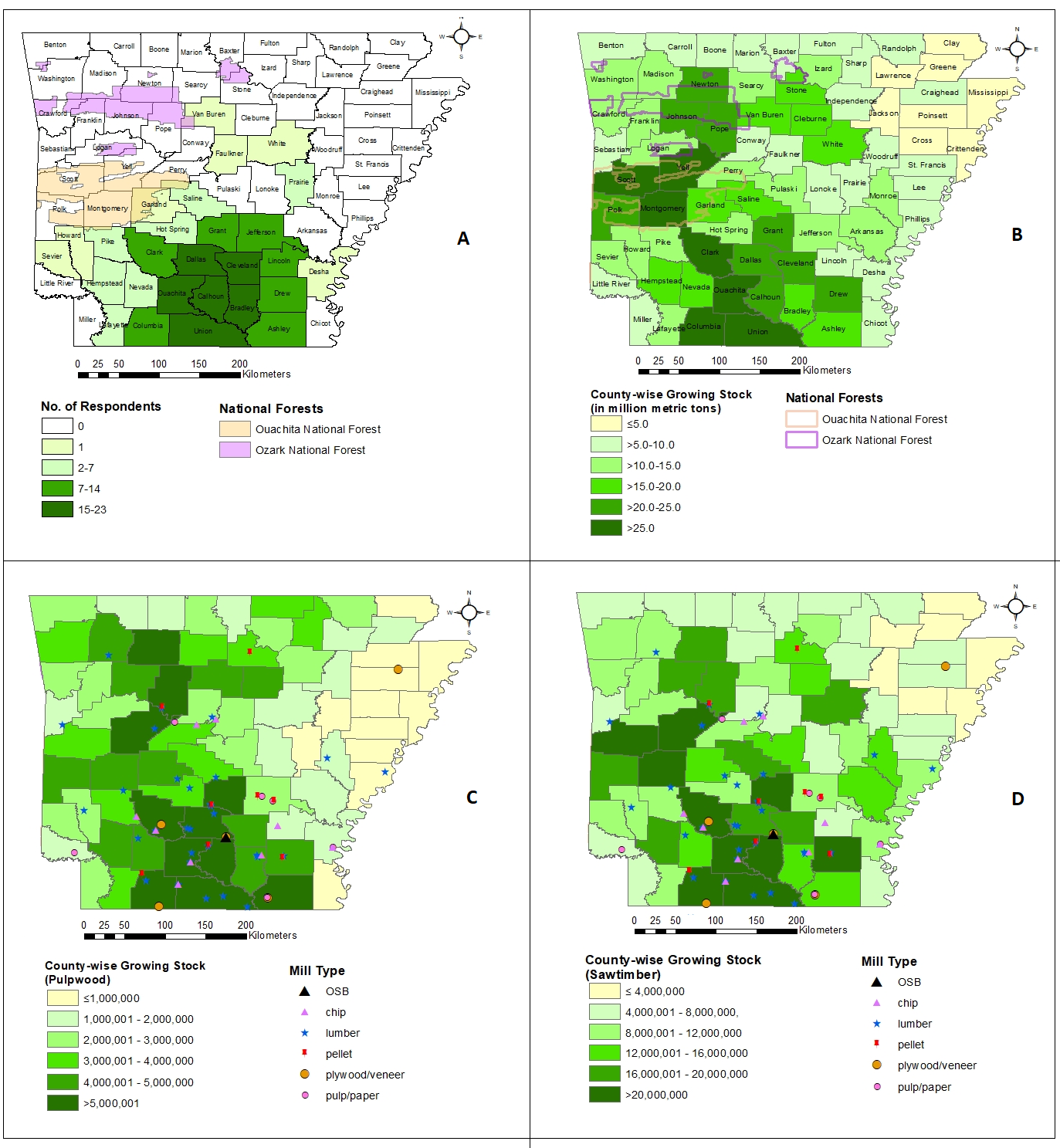 Arkansas has more than 7.3 million hectares of forestland, 56% of the state’s land area. Private forest landowners own 67% of Arkansas’ forestlands. Family forests account for 58%, corporate forests account for 10%, and the remainder are other institutional owners (Arkansas Department of Agriculture 2022; USDA Forest Service 2022). Approximately 20,000 hectares of non-forest land revert to forest annually. Arkansas’ economy is the most forestry-dependent of all the southern states (Pelkki and Sherman 2020); forest industries contribute more than six billion dollars (or 5%) annually to the state’s Gross Domestic Product. Also, more than 61 thousand jobs are supported by the forestry sector (Tian and Pelkki 2021).